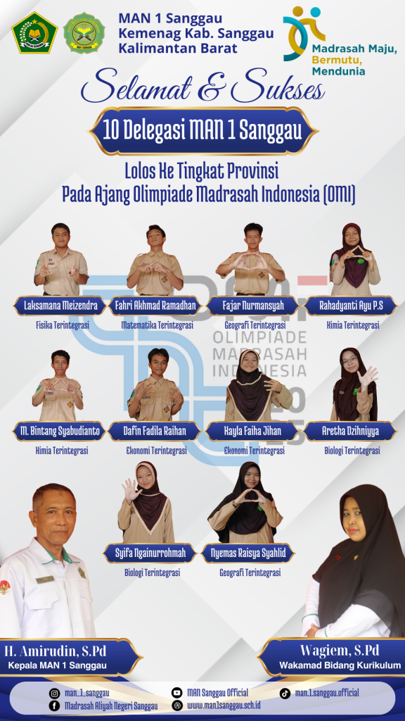 Sanggau (MAN 1 Sanggau) – Prestasi membanggakan kembali ditorehkan oleh MAN 1 Sanggau. Sebanyak sepuluh siswa delegasi madrasah ini berhasil melaju ke ajang Olimpiade Madrasah Indonesia (OMI) tingkat provinsi setelah melalui seleksi ketat di tingkat kabupaten.